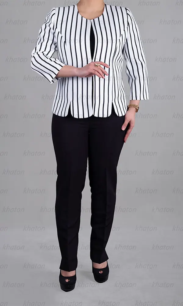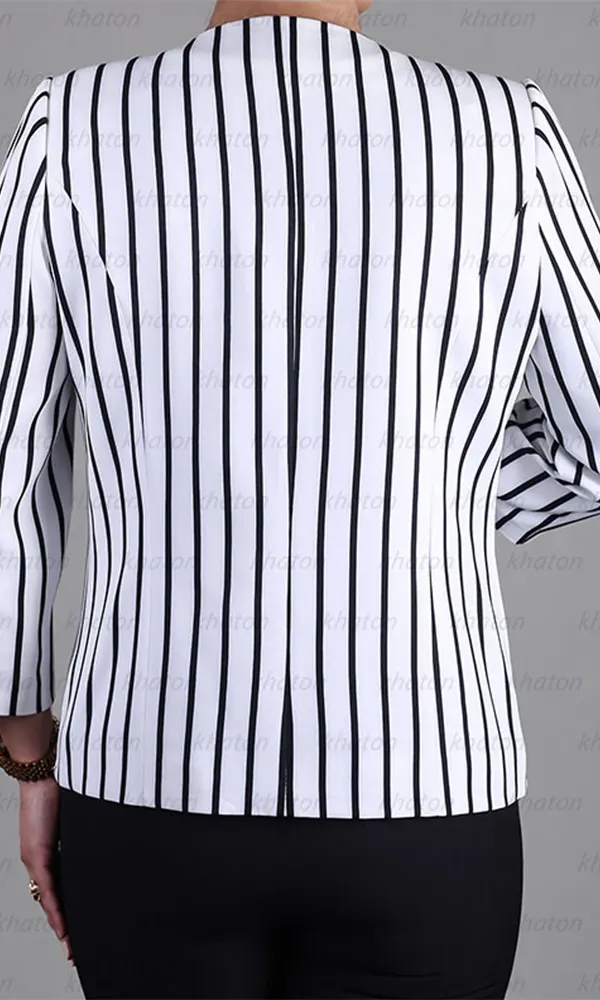 کت تاپ راه راه سفید مشکی، آستین سه ربع، قزن دار،چهار فصل، جلو چاک دار،